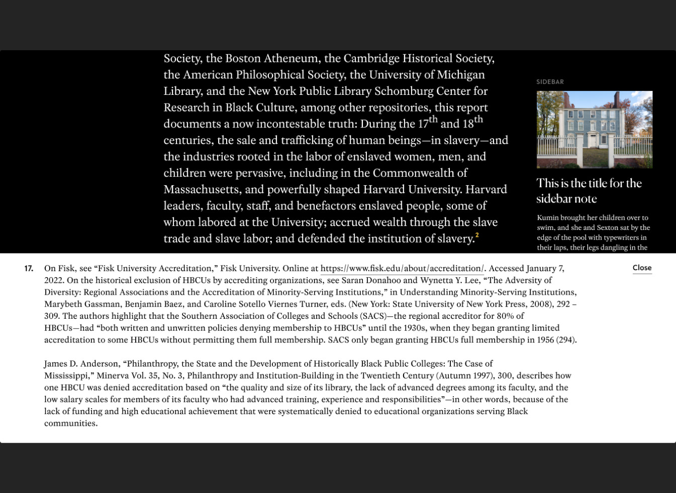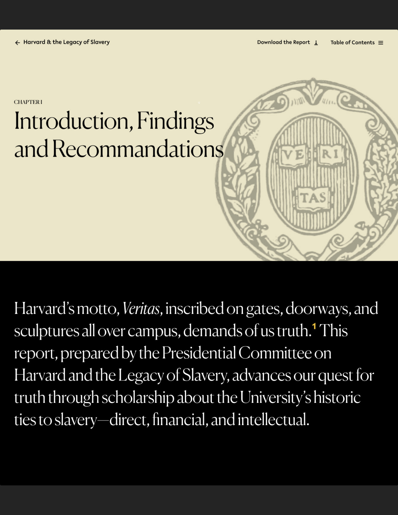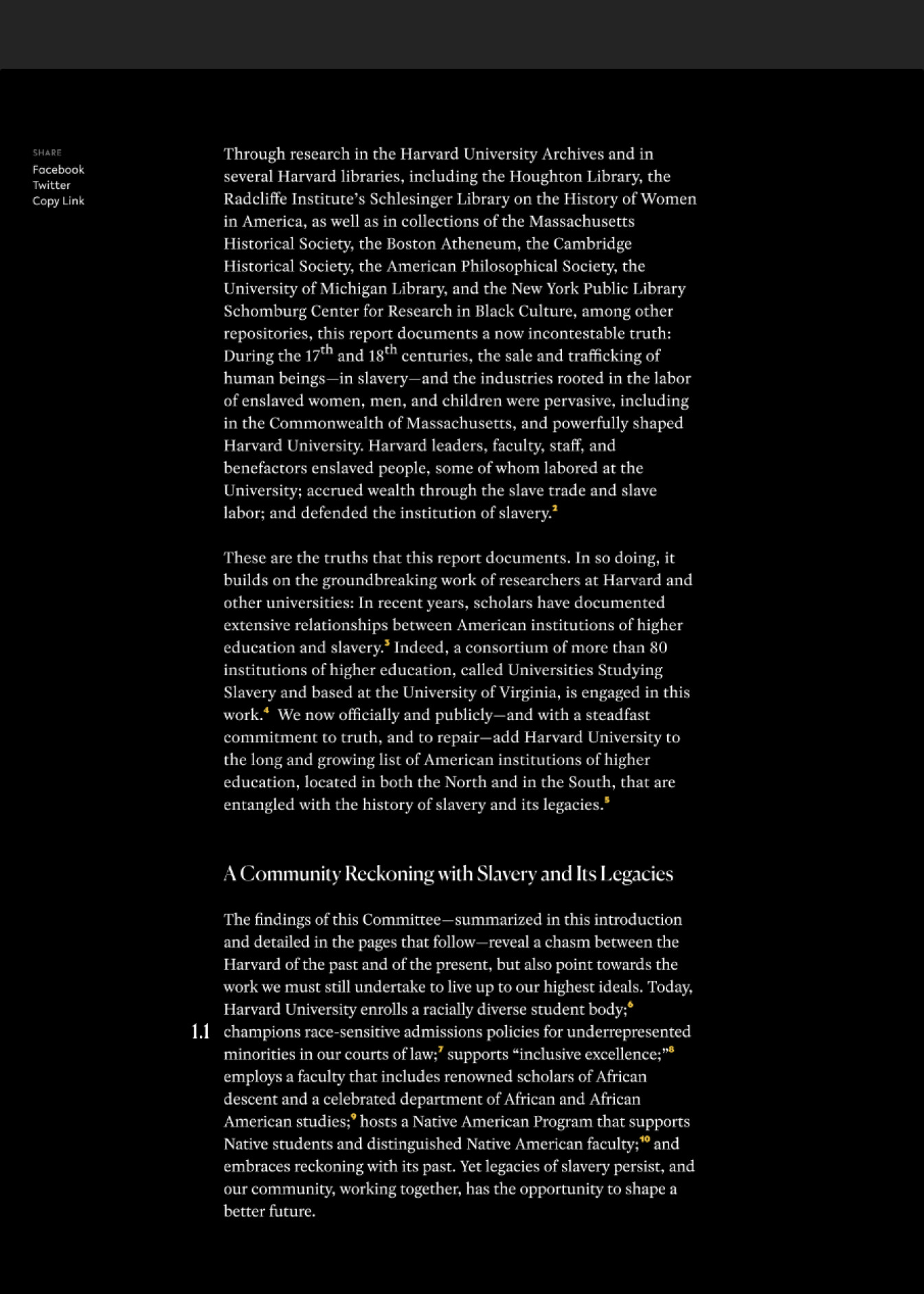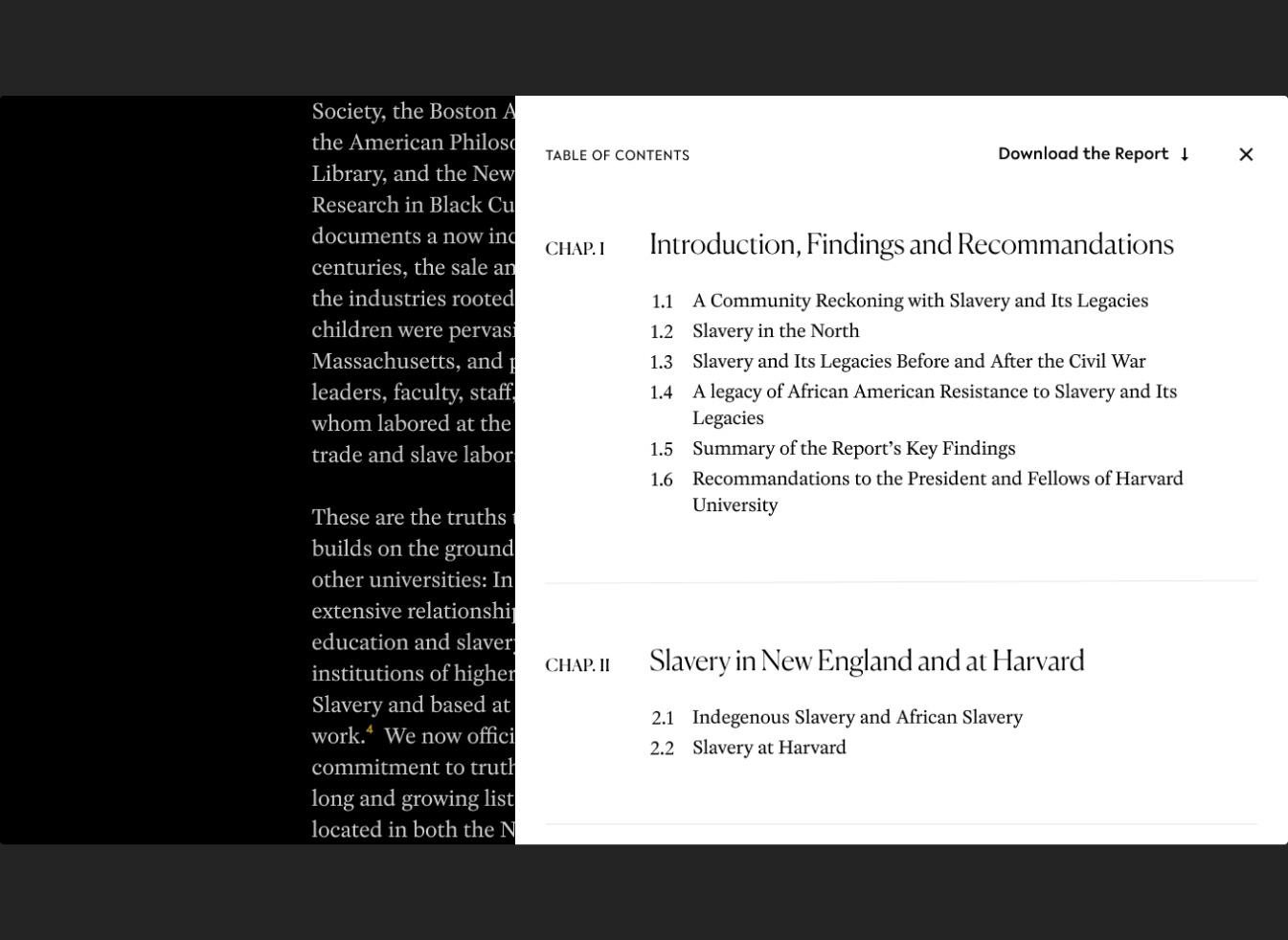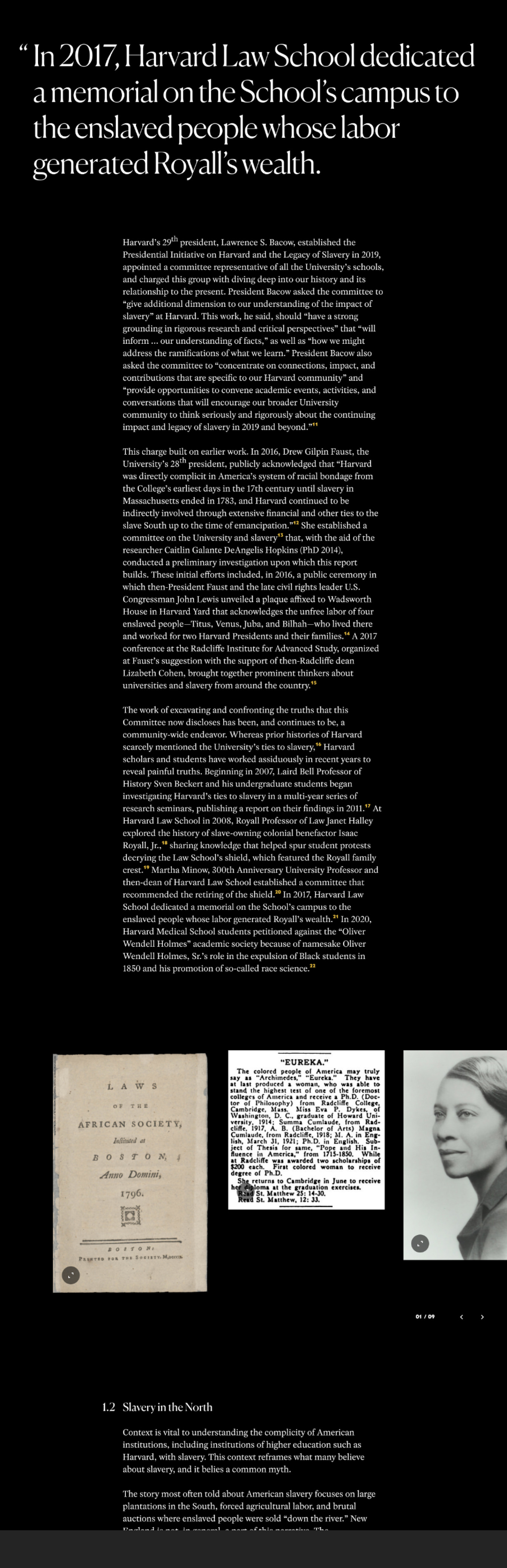 Le 26 avril 2022, le président de Harvard, Larry Bacow, a publié le rapport du comité sur Harvard et l'héritage de l'esclavage, a accepté l'intégralité des recommandations du comité et a annoncé un engagement historique de 100 millions de dollars pour financer leur mise en œuvre.