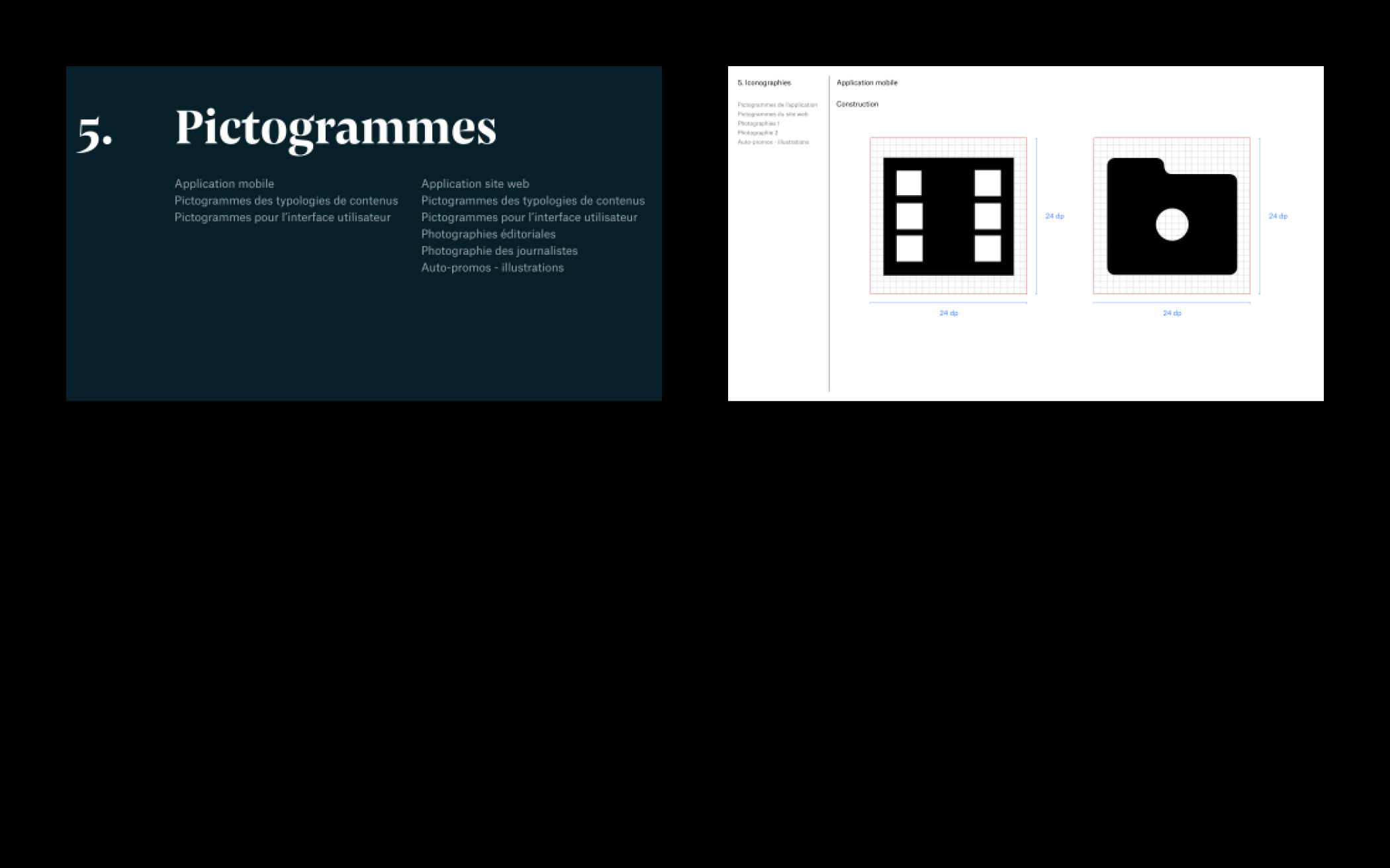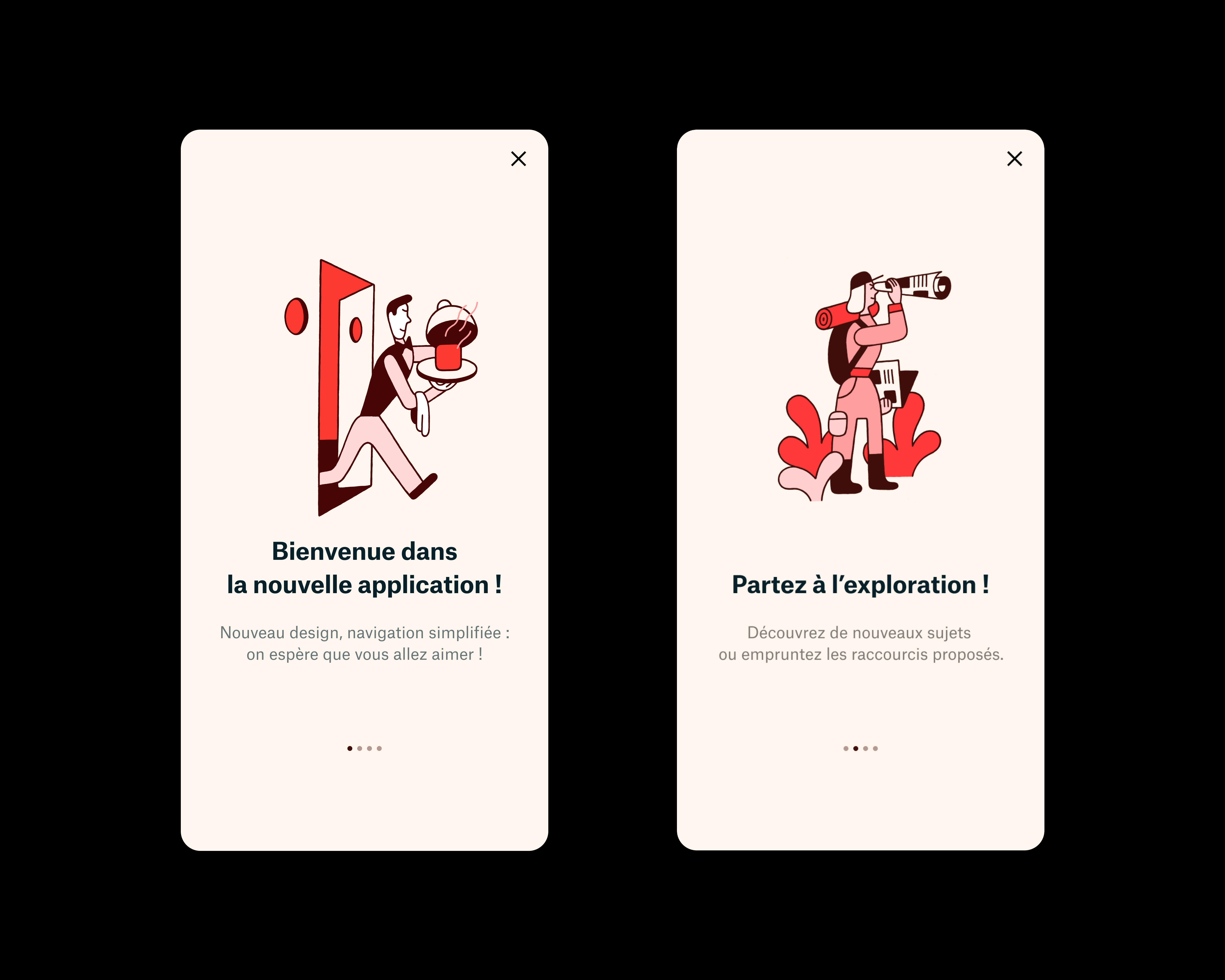 La mise à jour de l’application consistait à harmoniser tous les composants d'interface qui constituent le design éditorial du journal dans un design système : navigation et design d’interface, différentes unes et manchettes, identification des différentes typologies de contenus (Enquêtes, podcasts, reportage photo, émission À l’air libre etc.).