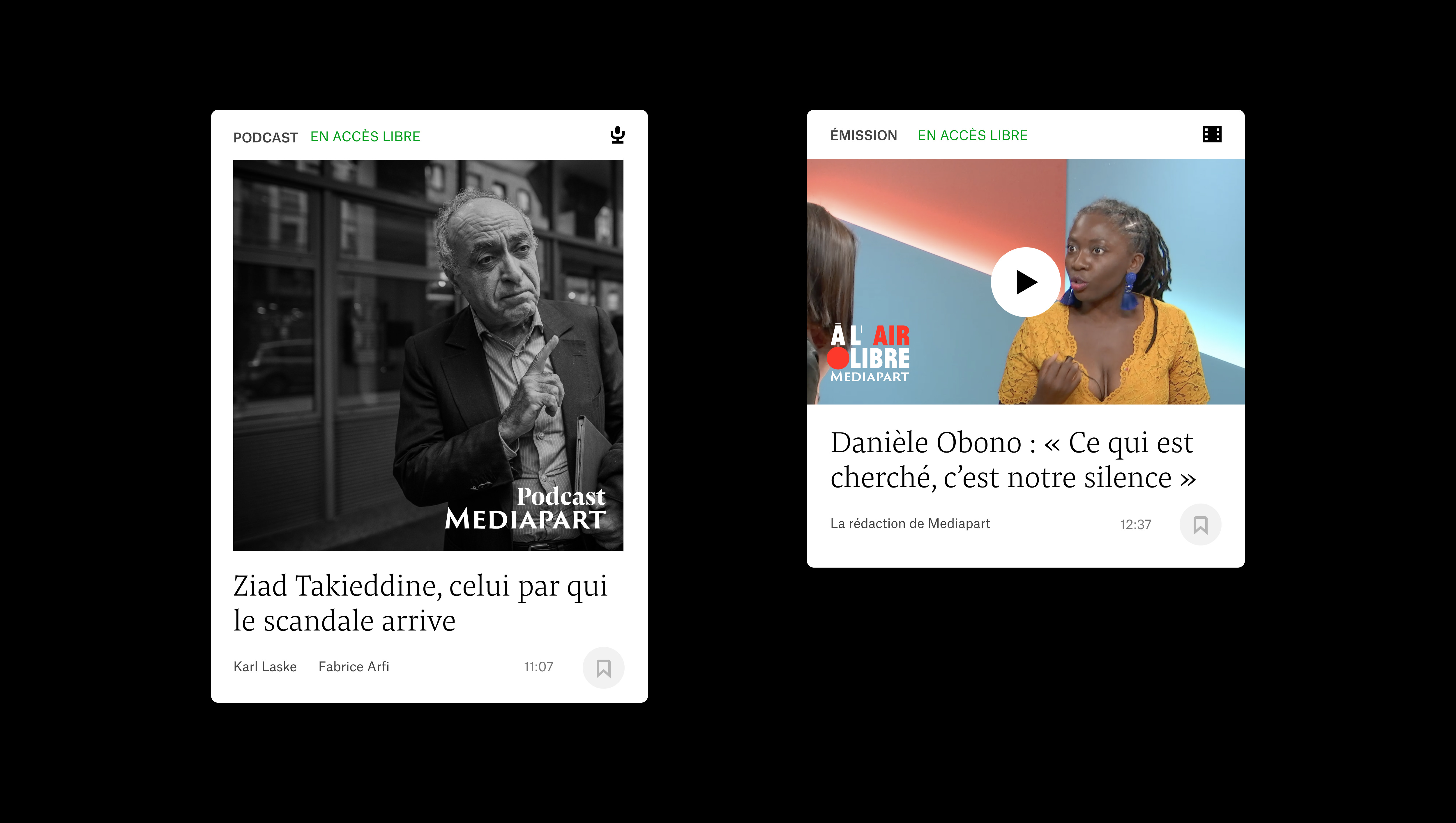 Intégré à la rédaction de Mediapart entre 2019 et 2020, je suis intervenu sur la refonte de l’application mobile qui a été le premier chantier Design. Ce travail avec l’équipe Mobile a débouché sur une harmonisation globale de l’identité graphique : usage du logotype, système chromatique, usages typographiques, pictographiques, réseaux sociaux…