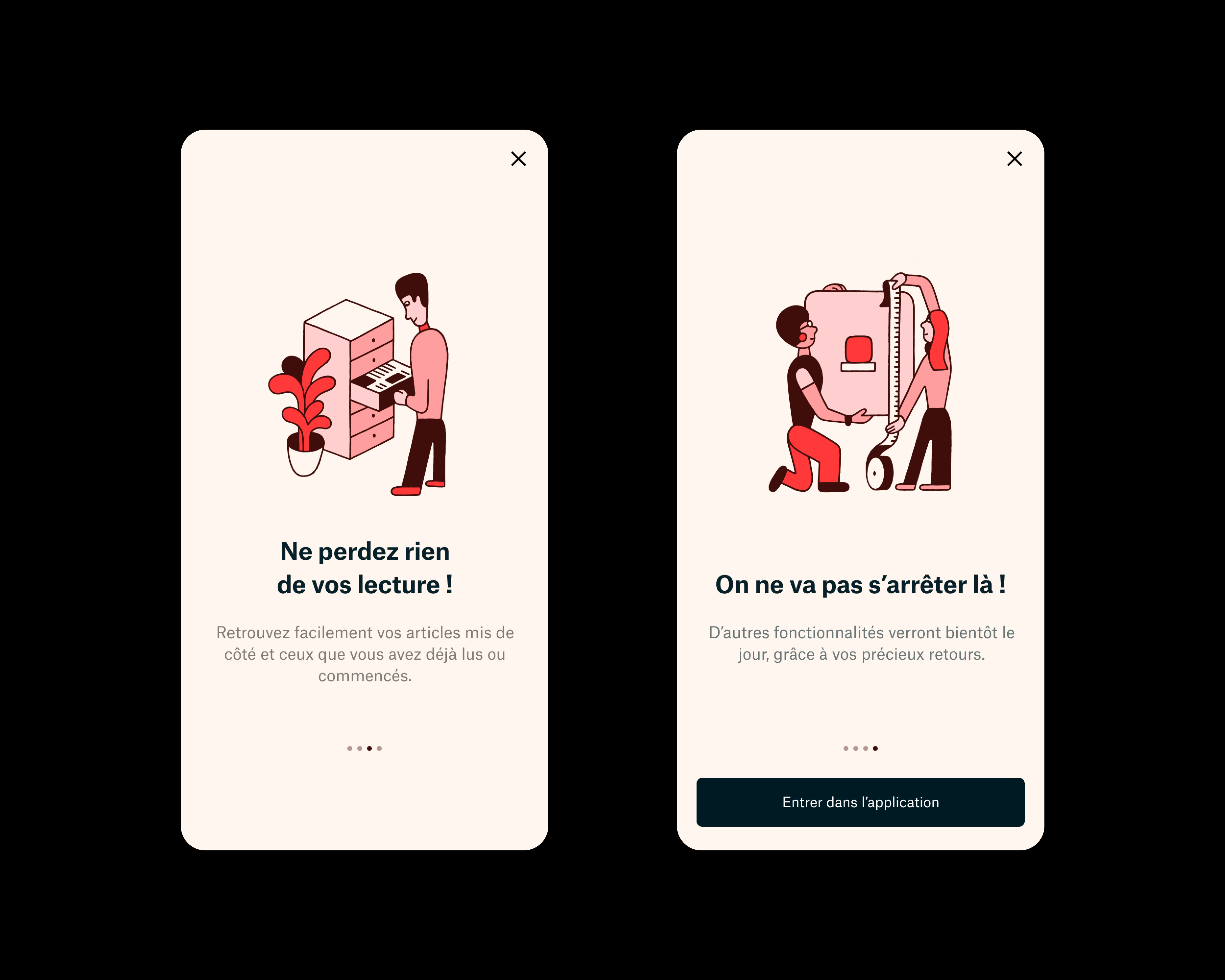 Ce travail a été menée en étroite collaboration avec l’équipe Mobile : Audrey Williamson (UX), Vincent Pomageot (dév), Ludovic Gonthier (dév), Clara Cerdan (marketing) et Donatien Huet (journalisme) ainsi que les équipes du site web, de la rédaction, de la communication…
