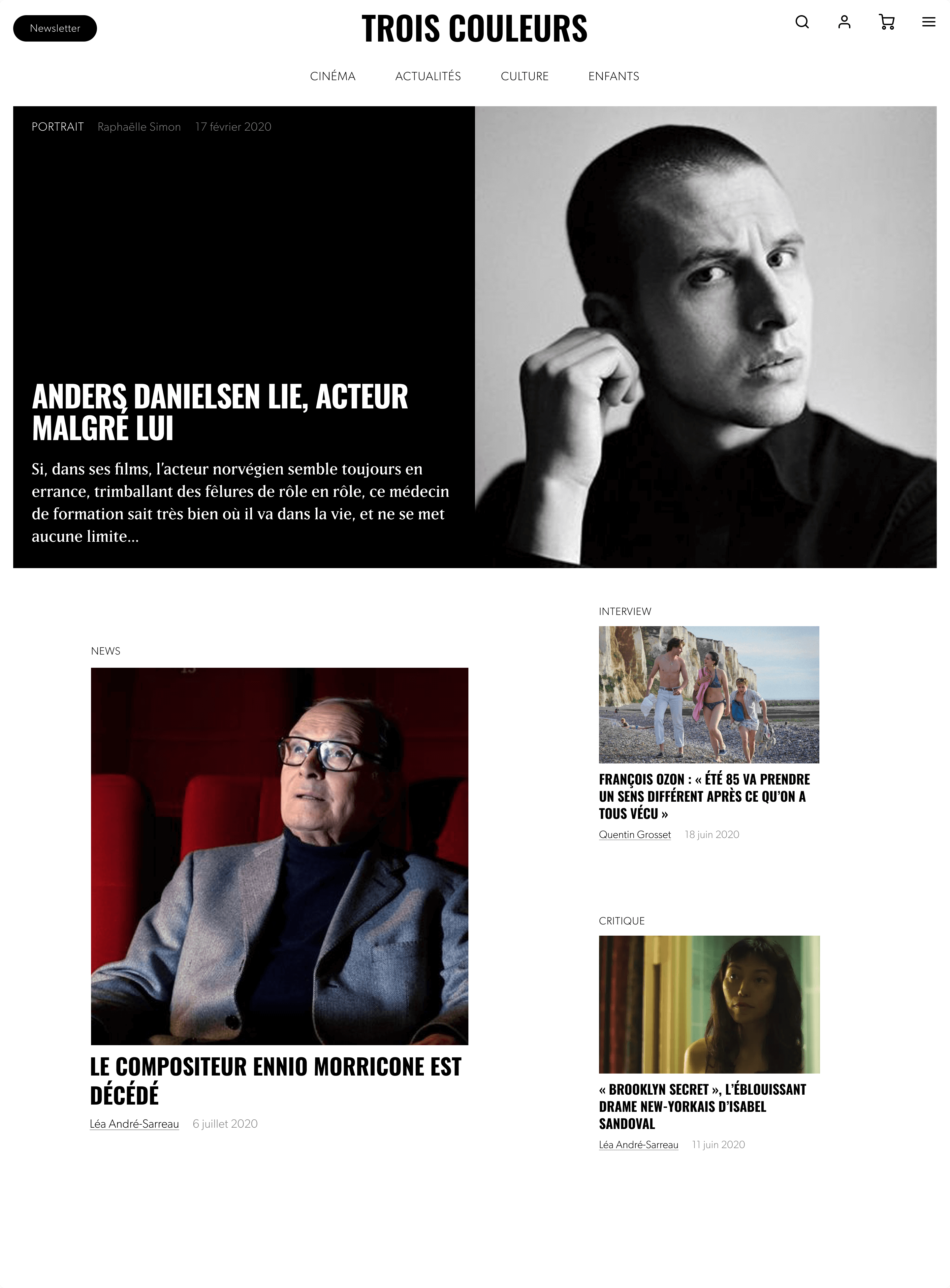 Direction artistique de l'écosystème MK2 qui comprend quatre espaces : la billeterie, mk2 curiosity, institute et le magazine Trois couleurs. Ce travail a été réalisé dans le cadre de l’appel d’offre lancé pendant l’été 2020 pour la refonte globale des sites. L’objectif était de travailler sur un design système homogène et de créer une navigation transverse entre l’offre cinématographique, VOD, évènementielle et éditoriale.