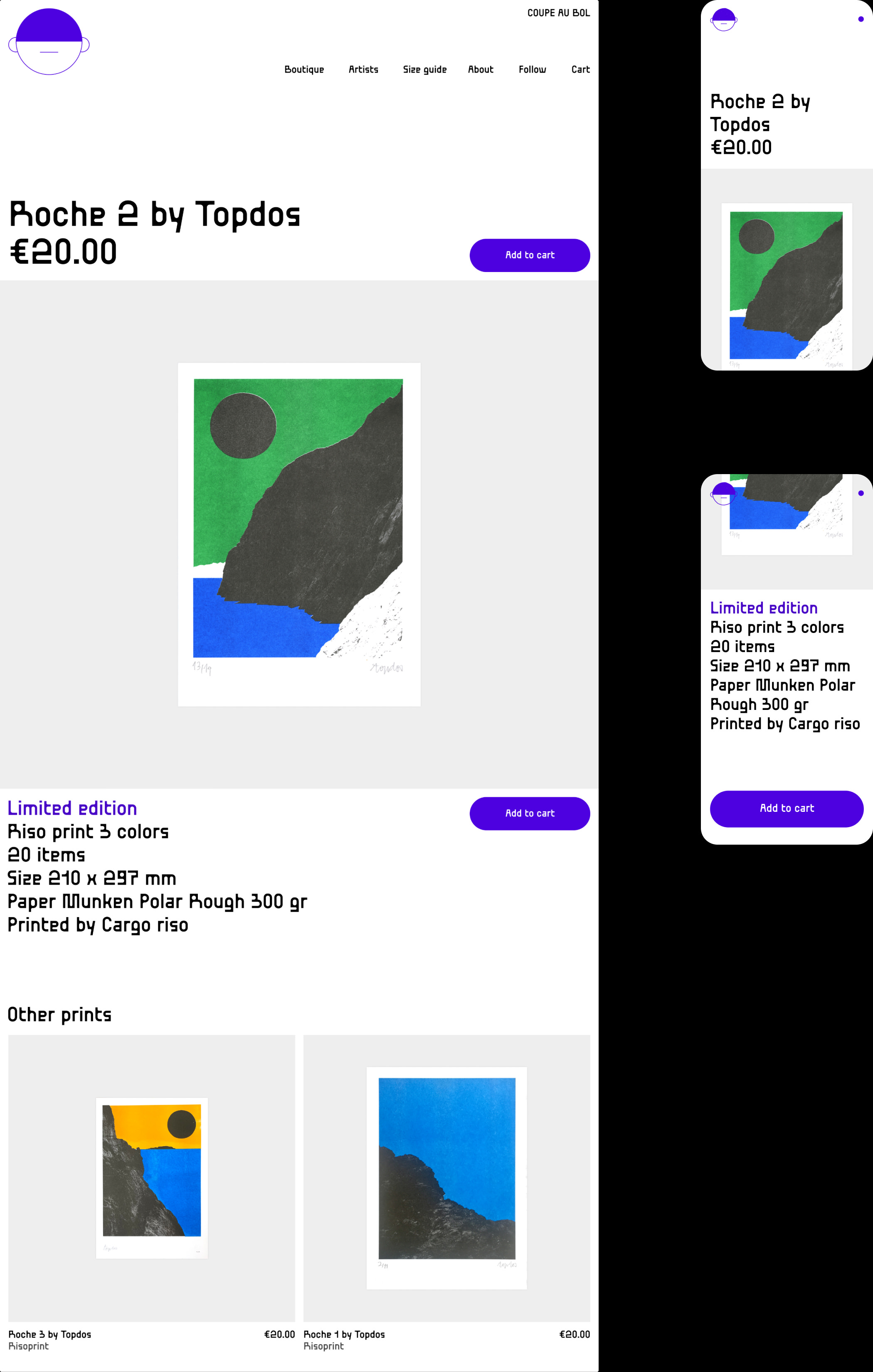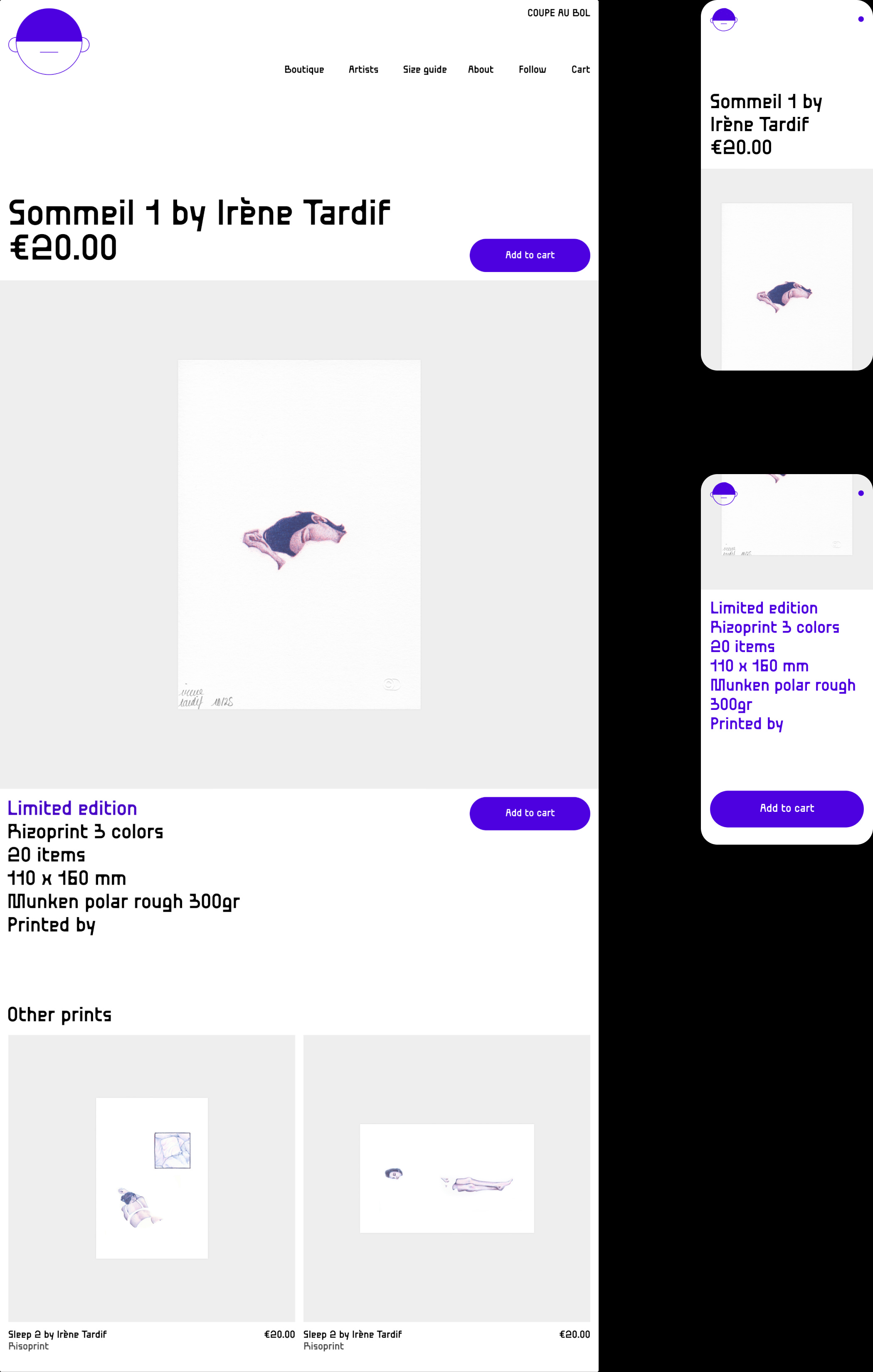 Coupe au bol est un collectif basée à Marseille qui édite, imprime et vend des tirages d'artistes autour de l'image imprimée et de l'illustration. J'ai pu réalisé le logotype ainsi que le site web codé soigneusement par Irène Tardif.