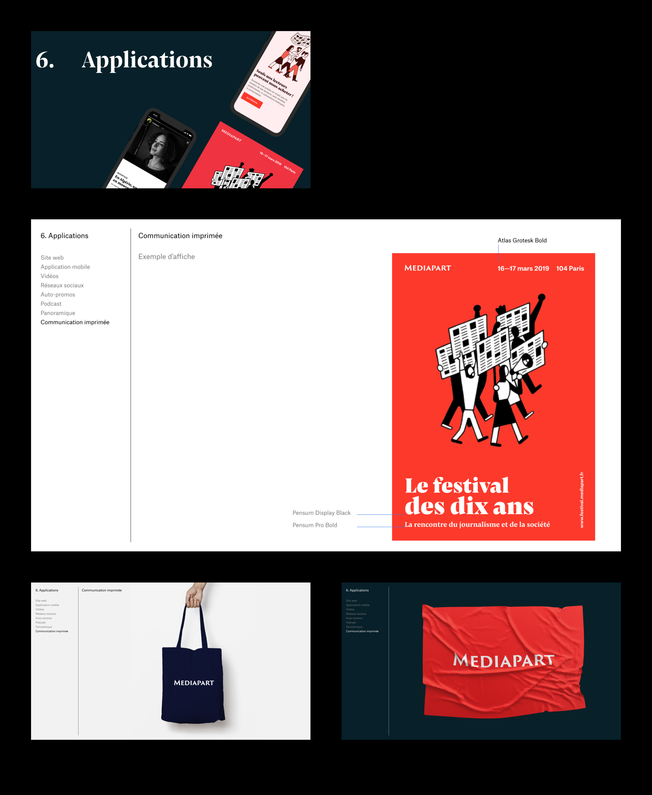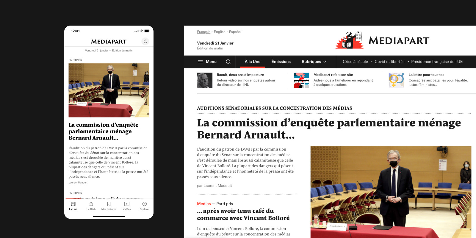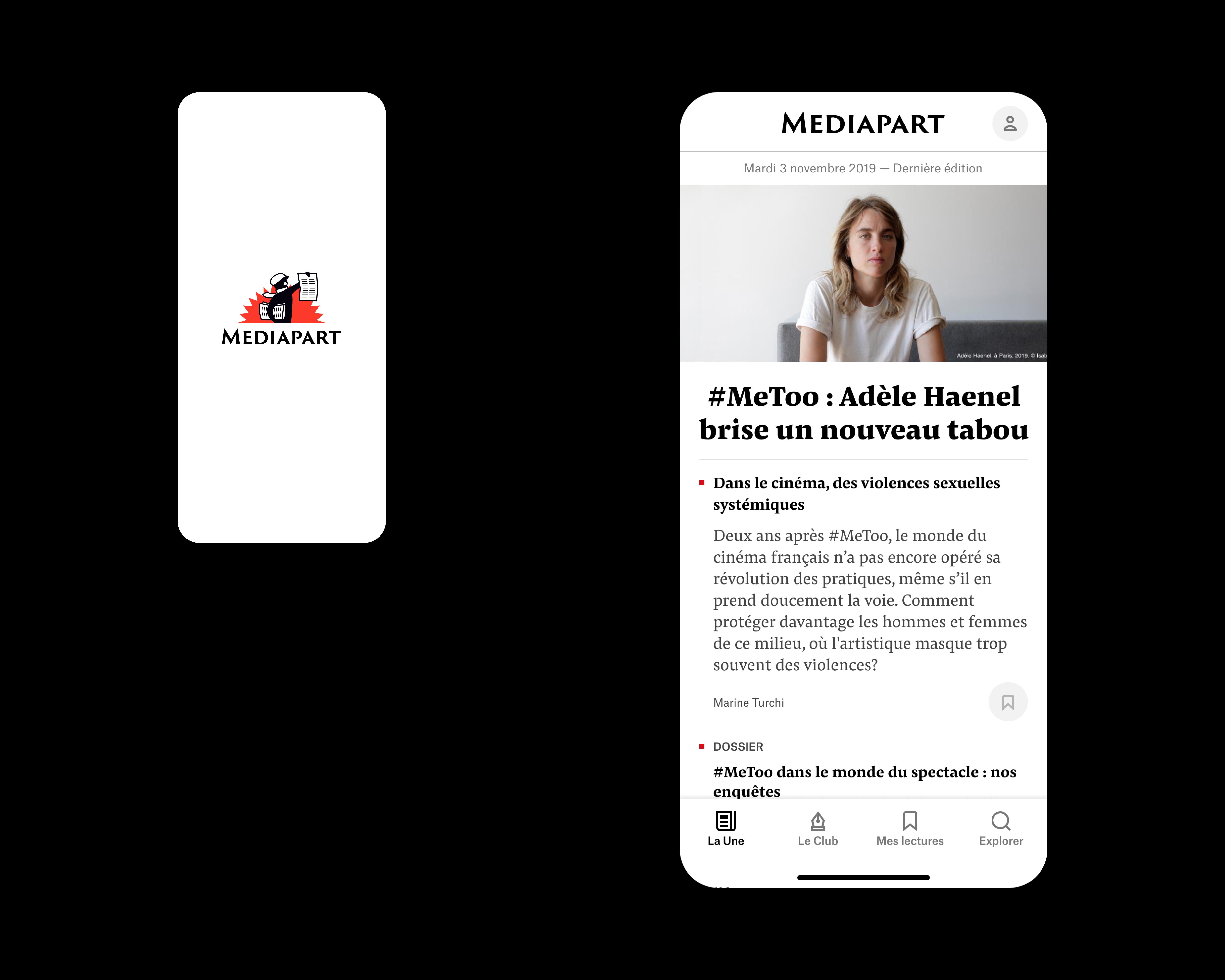 Intégré à la rédaction de Mediapart entre 2019 et 2020, je suis intervenu sur la refonte de l’application mobile qui a été le premier chantier Design. Ce travail avec l’équipe Mobile a débouché sur une harmonisation globale de l’identité graphique : usage du logotype, système chromatique, usages typographiques, pictographiques, réseaux sociaux…